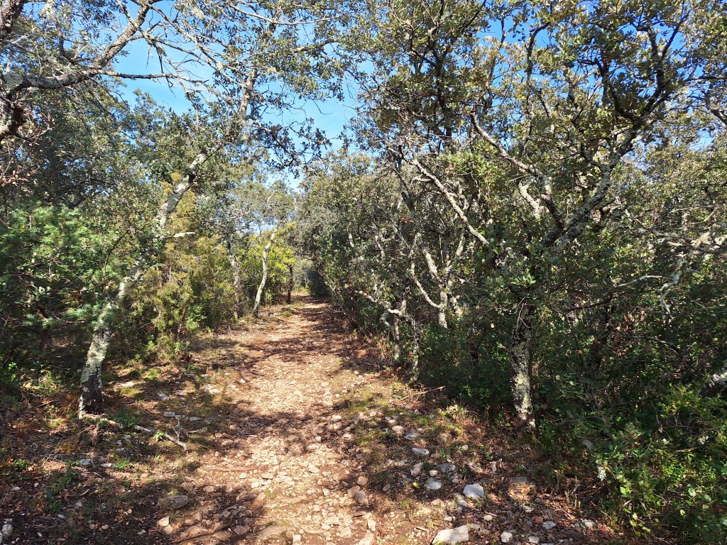Beim Wandern verändert sich die Garrigue ständig. Eben noch gehe ich über breite Naturstrassen, dann über steinige Pfade in dichtem Eichenwald. Zweimal verliere ich die Orientierung. Plötzlich sieht alles gleich aus: Pfade, Trockenmauern, Sträucher, Bäume.