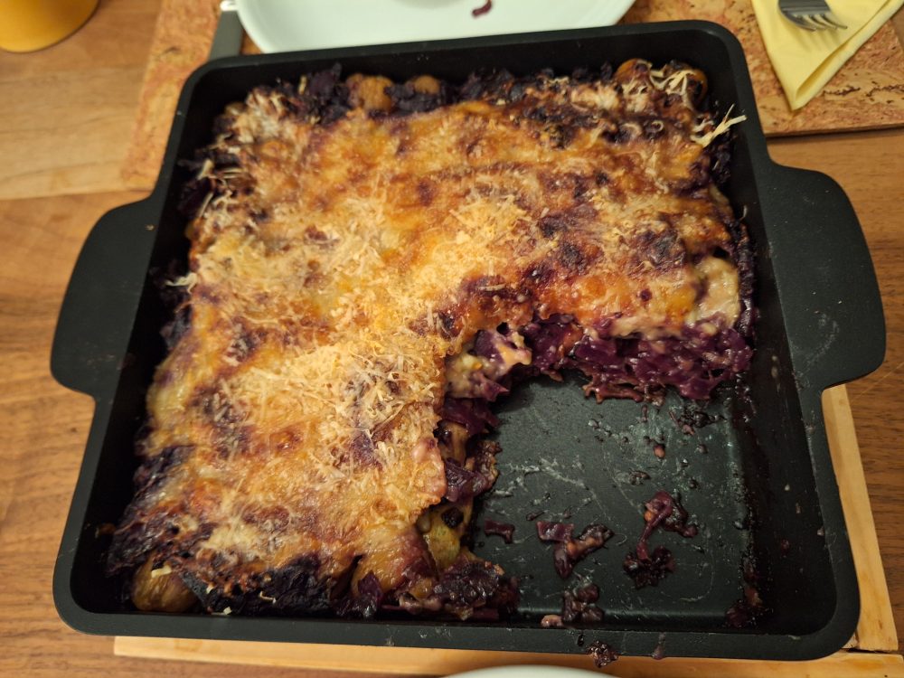 Heute Abend feiern wir den Abschluss unserer Malerarbeiten mit einer Rotkraut-Lasagne mit Marroni. Ich bereite sie das erste Mal zu. Sie schmeckt so gut, dass ich das Rezept zum Herunterladen bereit stelle.